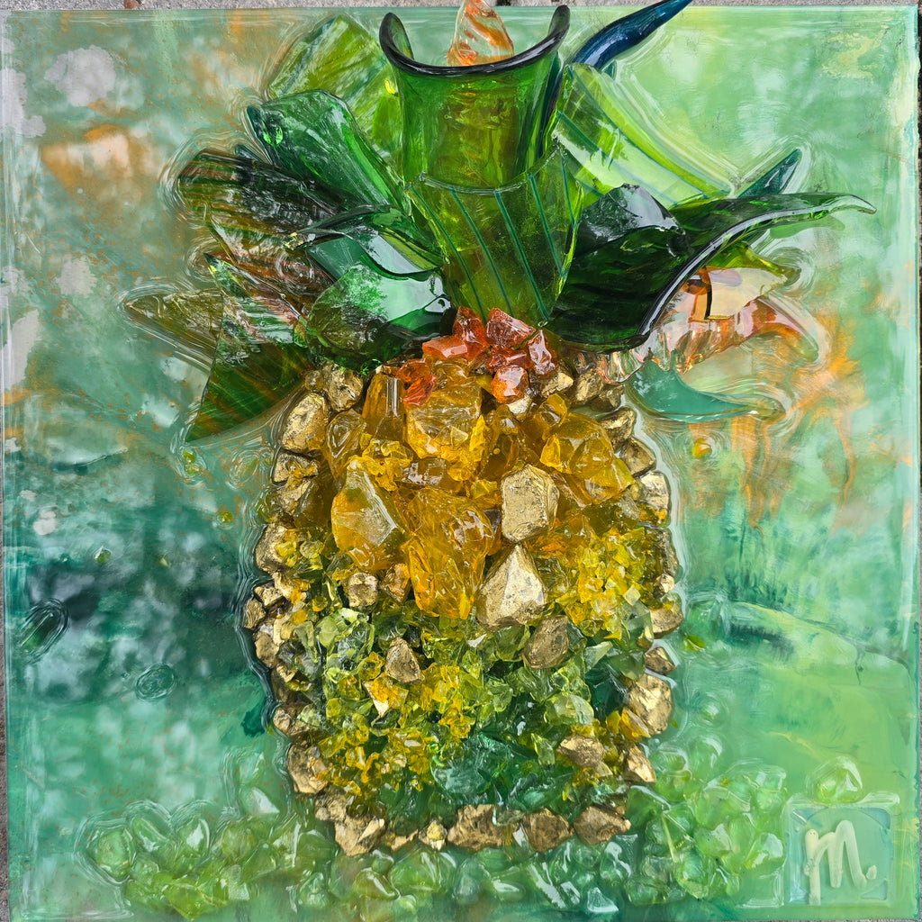 Repurposed glass, acrylic, and paint on framed board.